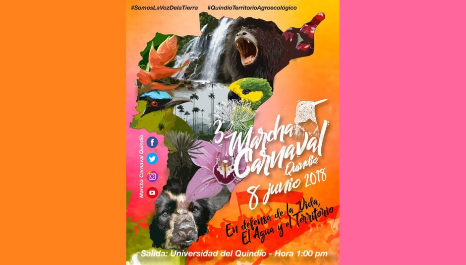 El viernes 8 de junio tendrá lugar en la ciudad de Armenia (Quindío) la III marcha carnaval en defensa de la vida, el agua y el territorio. La jornada partirá a las 10:00 AM en las afueras de las instalaciones de la Universidad del Quindío con una variada programación de actividades culturales y recreativas.