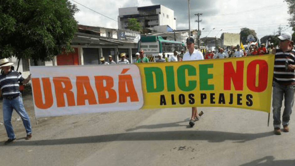 La medida de no instalar los peajes al interior de los municipios de la zona bananera era una de las principales exigencias de las comunidades urabaenses que protagonizaron protestas y paros generalizados en la primera semana del mes de enero de 2018. En las manifestaciones de rechazo se denunciaba por parte de los voceros de las protestas que la instalación de peajes dentro de los municipio a afectaría seriamente la economía y agravaría la complicada situación de crisis social existente en el Urabá.