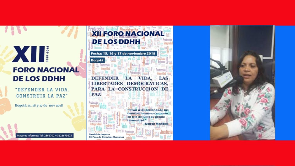 Durante los días 15,16 y 17 de noviembre se realizará en Bogotá el XII Foro Nacional por los Derechos Humanos: «Defender la Vida, Construir la Paz». Es el máximo evento que organiza el Comité Permanente por la Defensa de los Derechos Humanos en Colombia – CPDH-, por tal razón el comité de impulso hace un llamado a las seccionales y la comunidad nacional y mundial a ponerse en pie de lucha frente a la actual coyuntura que arroja una matanza cruel de líderes regionales, nuevos desplazamientos forzados en el Charco – Nariño; aparecen otra vez las masacres en Nariño, Cauca, Catatumbo y Meta; infinidad de amenazas, detenciones como las de líderes sociales en Acacias y Castilla, en el Meta.