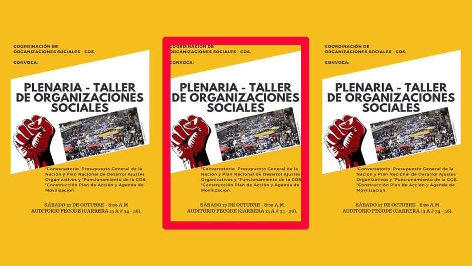 La Coordinación de Organizaciones Sociales COS, invita a la ciudadanía dela capital colombiana y del centro del país a participar en el Taller de Organizaciones Sociales convocado para el próximo sábado 27 de octubre en el Auditorio de la Federación de Educadores FECODE.