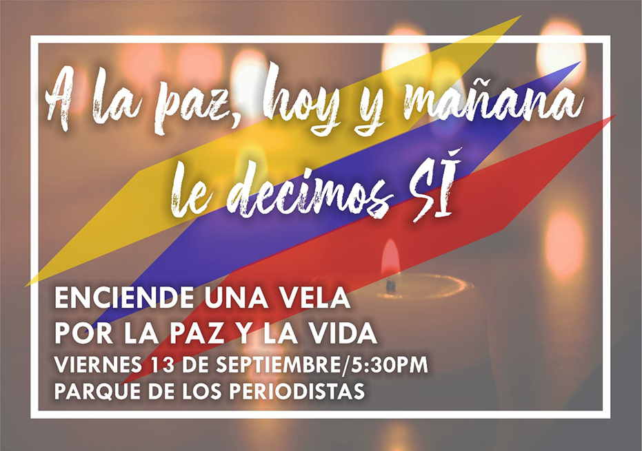 Por tal razón, nos sumamos este viernes 13 de septiembre a encender una vela por la Paz y la Vida, a partir de las 5:30 PM, en el Parque de los Periodistas (entre calles 16 y 17 y carreras 3ª y 4ª).