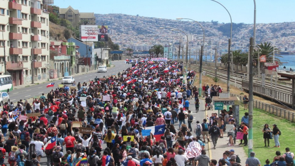 La movilización de este domingo 27 de octubre se trasformó acá en el Puerto en la “marcha de todas las marchas”, ya que nunca se había visto una cantidad tan gigantesca de manifestantes. Con dos puntos de encuentro, en Plaza Sotomayor de Valparaíso y en la Plaza Sucre de Viña del Mar, las enormes columnas se dirigieron alrededor de las 15 horas hacia el Congreso Nacional. La marea de manifestantes procedente desde Viña del Mar se extendía ininterrumpidamente entre el Reloj de Flores y el Nudo Barón, mientras en el plan de Valparaíso esta se extendía entre la Plaza Sotomayor y la Plaza del Pueblo.