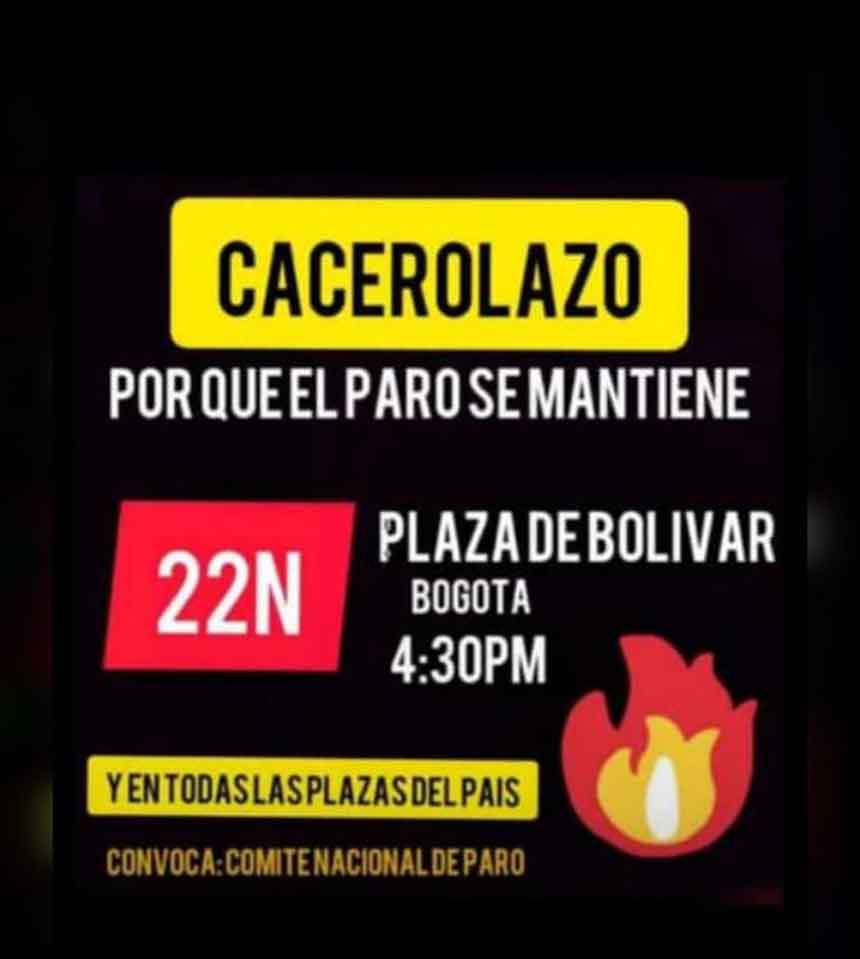 Dicha acción daría continuidad al cacerolazo que tuvo lugar anoche en Bogotá, Cali y Medellín después de más de nueve horas de movilizaciones ciudadanas en las calles.