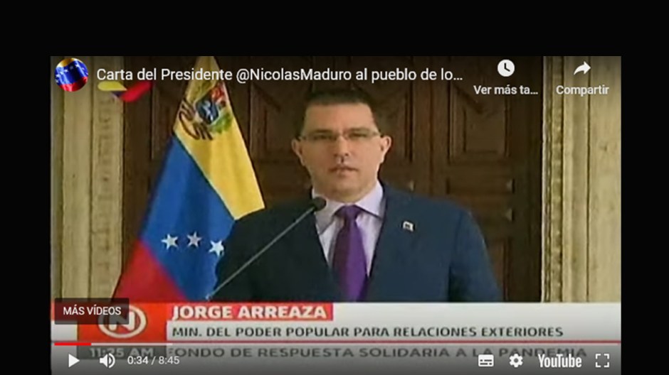 El canciller de la República Bolivariana de Venezuela, Jorge Arreaza, leyó este domingo una carta enviada por el Jefe de Estado, Nicolás Maduro al pueblo de Estados Unidos, donde insta a ponerle freno a lo que califica como un intento del presidente Donald Trump por instrumentalizar las instituciones de ese país para alcanzar sus objetivos electorales, basándose en infamias bajo pretexto de la lucha contra las drogas a través del cual ha ordenado el despliegue militar más grande hacia nuestra región en 30 años, en medio del combate contra la pandemia del Covid-19 que azota a la humanidad.