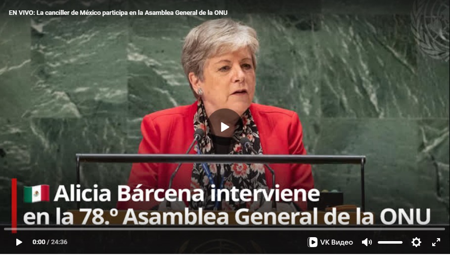 La canciller de México, Alicia Bárcena, intervinó este sábado en el Debate General de Alto Nivel del 78 Período Ordinario de Sesiones de Naciones Unidas, que se celebra en Nueva York desde el pasado 19 de septiembre.