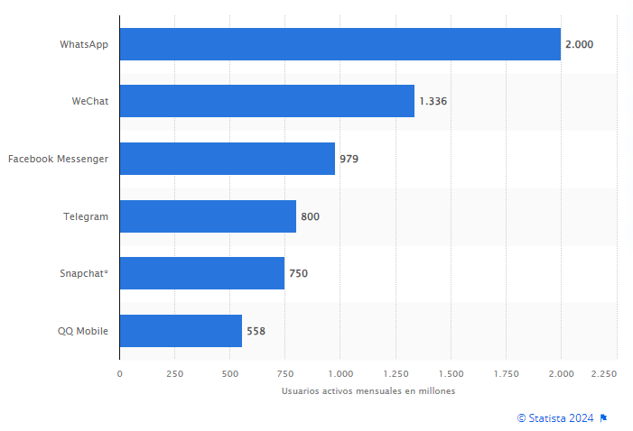WhatsApp y X están entre las aplicaciones más usadas en el mundo. WhatsApp tiene más de 2.000 millones de usuarios mensuales activos, según statista.com. Sus competidores más cercanos son WeChat, la app más usada en China, con 1.336 millones; luego Facebook Messenger, la app de mensajería más usada en Estados Unidos, con 979 millones; y luego Telegram con 800 millones.