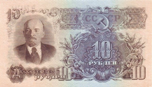 En la foto reverso del billete de 10 rublos y billete de 1 rublo con su imagen