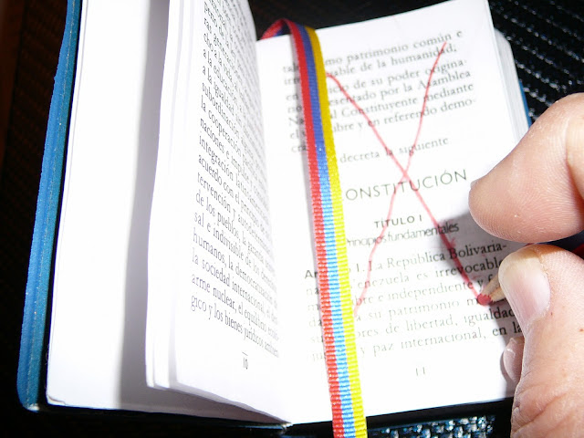 Una avalancha humana interrumpe el pillaje y repone a las autoridades legítimas. Blande ante las cámaras su arma secreta: un librito azul llamado Constitución de la República Bolivariana de Venezuela. Hablamos, desde luego, del 13 de abril de 2002. Dicha Ley Fundamental sigue vigente. Consultémosla.