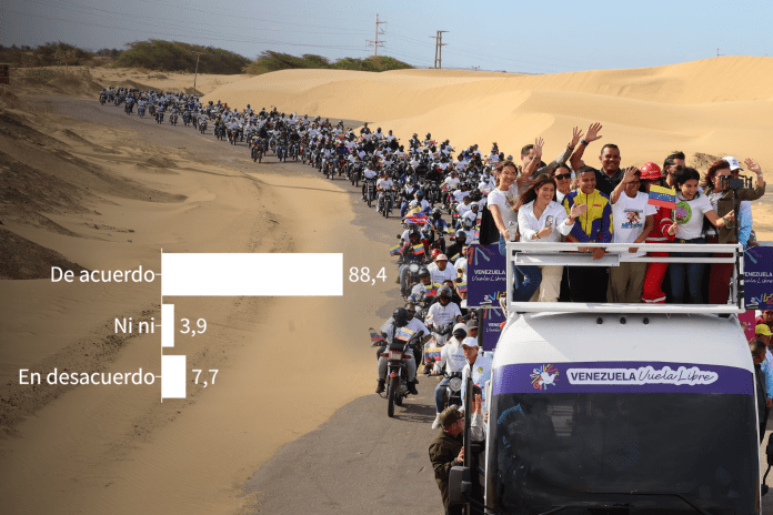 Los datos muestran que 88,4% coinciden con la necesidad de que todos los venezolanos dejemos atrás las diferencias para exigir unidos el cese de las sanciones contra el país. Quienes no están de acuerdo con esta unidad conforman 7,7% del total. En el centro están 3,9% que expresaron que no están ni de acuerdo ni en desacuerdo.