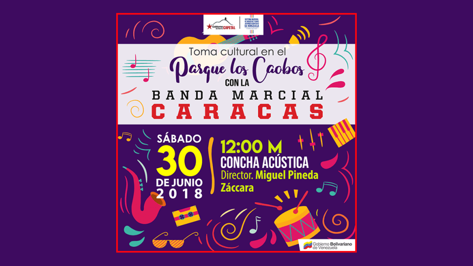 Para el día sábado 23 de junio a partir de la 1 de la tarde la Banda Marcial Caracas ofrecerá concierto gratuito a todos los transeúntes del Boulevard de Sabana Grande, denominado “Nuestro Boulevard es Cultura y Paz”, donde interpretarán obras entre las que destacarán “Bella Caracas”; “Fantasía para Banda Caracas”, del compositor Jhonny Quiroz; “Suite en Onda Nueva”, de Aldemaro Romero; “Ay mi tío”; “El chivo”; “Carmen la que contaba 16 años”, de Balbino García; entre otras.